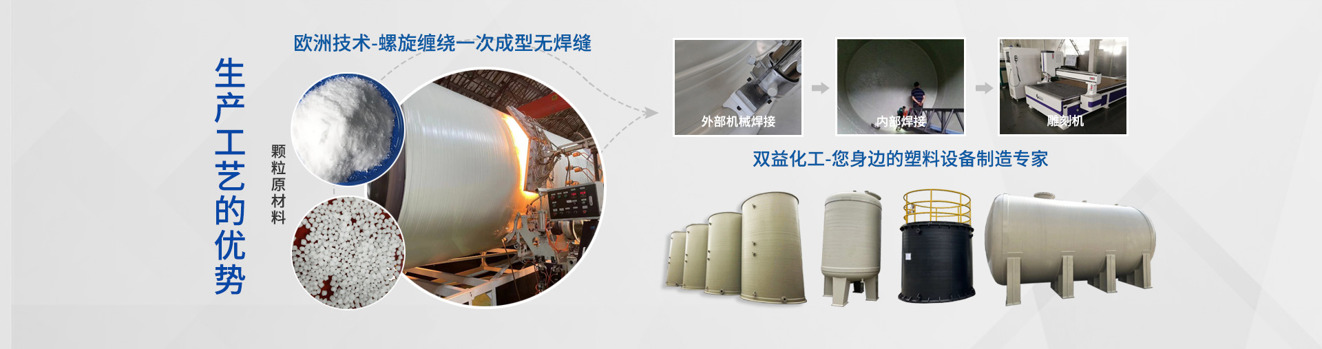 太仓市双益化工防腐设备有限公司坐落于美丽的江南水乡古镇-江苏太仓市沙溪镇,南靠上海,距上海虹桥机场50公里,西邻苏州70公里。公司引进欧洲先进技术-挤出缠绕无焊缝机组,自动化焊接技术及生产装备,保证了大型塑料设备加工的质量和精度,1500吨大型塑料封头注塑机,实现了从主体到附件,完全用同牌号材料加工制作而成。可根据需要储存的介质的性质和温度选择进口或国产原材料来生产不同系列等级的各种大型PP储罐,PPH储罐,PP搅拌罐,PP真空计量罐,聚丙烯反应釜,聚丙烯酸洗槽,塔器(洗涤塔,吸收塔,中和塔,脱味塔)等塑料防腐设备。